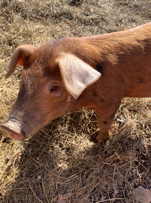 Let's do a quick roll call! Clockwise from left to right: Jimmy, the roster; Harrison Ford, the pet; Channing (not pictured Tatum), meat pigs; Em, with a borrowed bunny; the 4 Peking's, none of whom have names; a bitty quail; and Hawk; with one of the Peking's.
